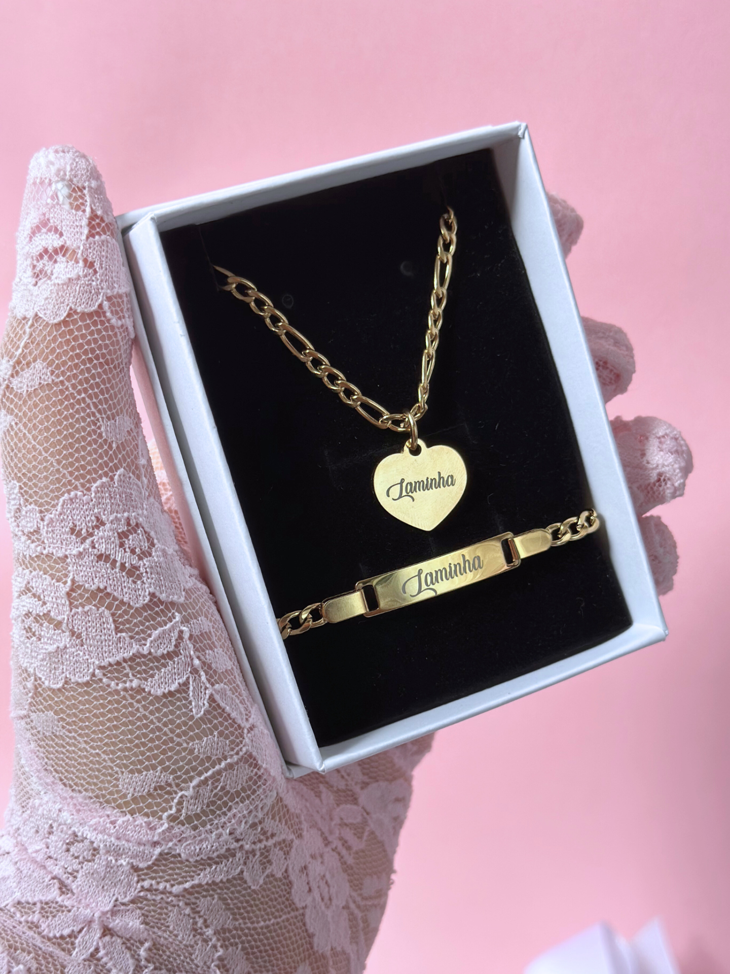 Conjunto de joalharia dourada com pulseira e colar gravados com a palavra Laminha, apresentados em caixa preta e branca